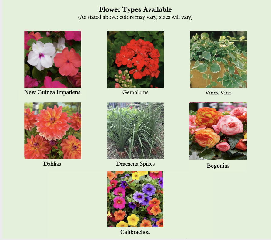 Please indicate how many of each type of plant/flower you would like to order. Please note that the colors of the plants may be different and the sizes of the plants will be different than those shown in the pictures below.
